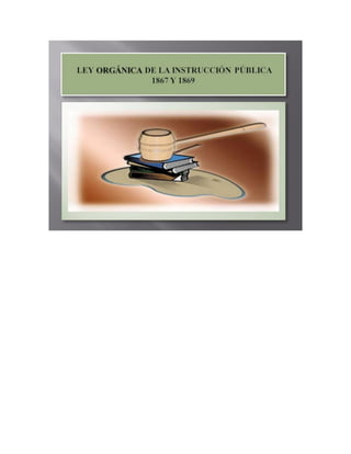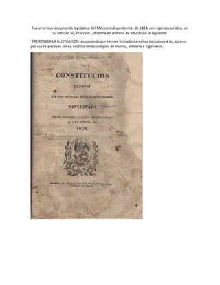 El documento describe la evolución de la educación en México desde la primera constitución de 1824 hasta 1916. Algunos hitos incluyen que la constitución de 1824 promovió la ilustración y la educación superior, mientras que en el siglo XIX figuras como Gómez Farías y Juárez laicaron el sistema educativo y otorgaron más autonomía al estado. La constitución de 1857 declaró la libertad de enseñanza. Leyes posteriores establecieron una educación gratuita, obligatoria y laica para México.