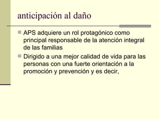 El documento presenta los lineamientos programáticos 2008 de la Atención Primaria de Salud en Chile. Destaca que la APS adquiere un rol protagónico en la atención integral de las familias con un enfoque en la promoción y prevención de la salud. Se enfocará en mejorar la calidad de vida de las personas mediante un equipo de salud multidisciplinario y de liderazgo horizontal que acompañe a las familias durante todo su ciclo vital.