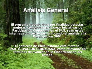 Este documento presenta lineamientos para mejorar la participación ciudadana interna y externa en el Servicio Agrícola y Ganadero de Chile. Actualmente, existen algunas iniciativas aisladas pero no una visión institucional. Se proponen acciones como e-learning, comunidades de práctica, y mejorar el intercambio con la comunidad para actualizar normativas considerando las realidades locales.