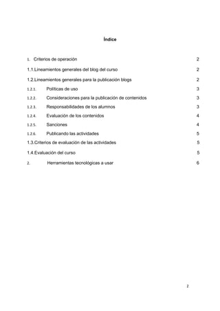 Este documento presenta los criterios de operación para un curso que utilizará blogs y herramientas tecnológicas. Incluye lineamientos para tres blogs: el blog del curso administrado por el profesor, blogs individuales administrados por estudiantes o el profesor, y un blog para los estudiantes. También describe políticas como el uso de etiquetas, consideraciones para publicar contenido, responsabilidades de los estudiantes, criterios de evaluación y sanciones. Finalmente, presenta tres herramientas tecnológicas clave que se util