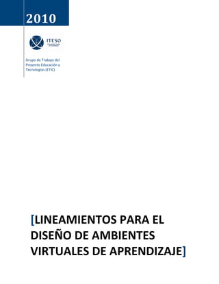 Este documento presenta lineamientos para el diseño de ambientes virtuales de aprendizaje (AVA) en el ITESO. Incluye lineamientos pedagógicos, comunicacionales y técnicos. Los lineamientos pedagógicos se enfocan en la organización de la información del curso, las actividades de aprendizaje y espacios de interacción. Los lineamientos comunicacionales promueven una comunicación efectiva y respetuosa. Los lineamientos técnicos cubren aspectos como la operación de los cursos y el uso de derechos de autor. El