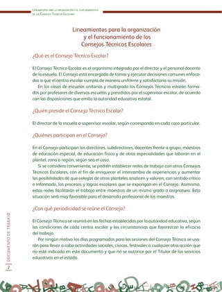 El documento proporciona lineamientos para la organización y funcionamiento de los Consejos Técnicos Escolares. Estos consejos están compuestos por el director y maestros de una escuela, y se encargan de tomar decisiones para garantizar el cumplimiento de la misión escolar. El documento describe la composición, funciones, procesos y herramientas de los consejos, incluyendo la planificación, colaboración, observación entre pares y mejora continua de la enseñanza y el aprendizaje.