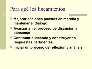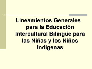 Los lineamientos generales para la educación intercultural bilingüe para niñas y niños indígenas tienen como objetivos mejorar las acciones educativas existentes, avanzar en el proceso de discusión y consenso, y continuar buscando respuestas pertinentes. Los lineamientos abordan conceptos como educación intercultural, educación bilingüe, el uso de lenguas, y la formación docente, la cual debe ser un proceso integrado, sistemático y permanente que desarrolle las competencias comunicativas de los maestros en lenguas ind