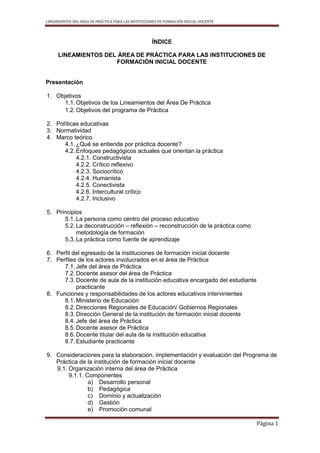 Este documento presenta lineamientos para el área de práctica en instituciones de formación inicial docente. Describe los objetivos, marco teórico, principios, perfiles de los actores involucrados y sus funciones. Además, provee consideraciones para la elaboración, implementación y evaluación del programa de práctica, incluyendo la organización interna y externa, estrategias metodológicas, y supervisión. El propósito es orientar a las instituciones formadoras para que desarrollen programas de práctica de calidad