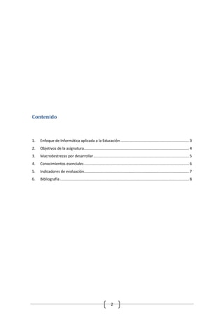 Este documento presenta lineamientos curriculares para la asignatura de Informática Aplicada a la Educación en el primer año de bachillerato ecuatoriano. Los objetivos son comprender la importancia de las TIC en el aprendizaje y usar herramientas tecnológicas de manera ética y funcional en las distintas asignaturas. Se detallan las macrodestrezas, conocimientos esenciales, y los indicadores de evaluación, incluyendo el uso de herramientas ofimáticas, navegadores, correo electrón