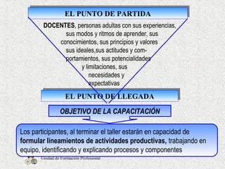 El documento describe los pasos para implementar proyectos productivos educativos en centros de formación profesional. Explica que estos proyectos (1) son productivos porque producen bienes y conocimientos, (2) son educativos porque enseñan competencias laborales y emprendimiento, y (3) son participativos porque involucran a todos los estudiantes. Luego, detalla los 5 pasos clave para los proyectos: 1) análisis de necesidades, 2) determinación de la idea del proyecto, 3) planificación, 4) ejecución