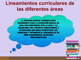 Este documento presenta los lineamientos curriculares para la educación inicial en el distrito capital. Los objetivos principales son difundir los derechos de los niños, reconocer el importante trabajo de los maestros, y garantizar una educación integral y de calidad para los niños. El documento también describe los pilares de la educación inicial como el juego, la comunicación, lo personal-social, la literatura, el arte, lo cognitivo y lo corporal.