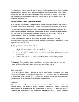 El documento presenta las diferentes líneas de acción en comunicación, incluyendo la comunicación interna, externa, intermedia, relaciones públicas, comercial, financiera y de crisis. Detalla los tipos de comunicación, sus objetivos, herramientas y estrategias. La comunicación interna busca mejorar el ambiente laboral a través de la escucha, circulación de información y trabajo en equipo. La comunicación externa pretende mejorar la imagen de la organización y sus relaciones con los medios.