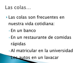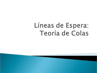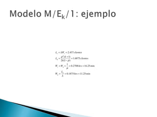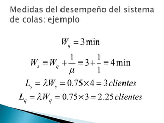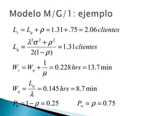 El documento explica los conceptos básicos de las teorías de colas y sistemas de colas. Define qué es una cola y un sistema de colas, e identifica sus componentes principales como la cola, la instalación de servicio y las llegadas. Explica conceptos como tasas de llegada, tiempos de servicio, factores de utilización y diferentes modelos de colas como M/M/1, M/G/1 y M/D/1. Finalmente, muestra ejemplos numéricos de cálculo de medidas de desempeño para diferentes sistemas de col