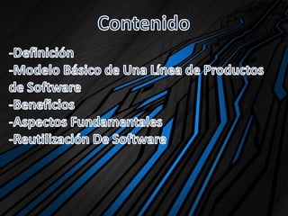 El documento describe los conceptos y procesos clave de las líneas de productos de software. Explica que una línea de productos de software es un conjunto de sistemas de software que comparten características comunes y que son desarrollados a partir de un conjunto de activos fundamentales de software de manera predefinida. También describe los beneficios de las líneas de productos de software, como la entrega más rápida y económica de productos de software de alta calidad.