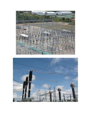 Este documento describe los principales elementos de una línea de transmisión eléctrica, incluyendo conductores, torres de soporte, aislamiento y aisladores. Explica que los conductores están hechos de cobre, aluminio u otras aleaciones y que las torres de soporte son estructuras altas construidas con acero que sostienen los conductores. También describe los diferentes tipos de aislamiento y aisladores utilizados, incluyendo porcelana, vidrio y materiales compuestos, y cómo cumplen la función de aislar eléctricamente los