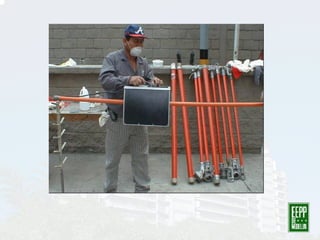 Este documento presenta información sobre técnicas y procedimientos de mantenimiento en línea viva. Explica los principios y usos de las técnicas de distancia, contacto y potencial, así como normas de seguridad, equipos aislados, elementos de protección personal y cuidados requeridos. También describe características deseables para el personal de línea viva como habilidad manual, coordinación y temperamento tranquilo.