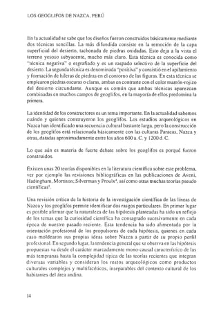El artículo analiza las investigaciones sobre los geoglifos de Nazca en Perú, destacando su construcción por culturas como los Paracas y Nazcas entre 600 a.C. y 1200 d.C. Se presentan diversas teorías sobre su propósito, que incluyen explicaciones astronómicas, calendáricas y rituales, y se enfatiza la importancia de comprender estos vestigios culturales en su contexto andino. Los geoglifos, que han sido dañados a lo largo del tiempo, están protegidos por leyes peruanas y reconocidos como patrimonio cultural por la UNESCO.