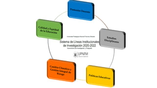 El documento presenta seis líneas de investigación de la Universidad Pedagógica Nacional Francisco Morazán: 1) Políticas educativas, 2) Calidad y equidad de la educación, 3) Cambio climático y gestión de riesgos, 4) Profesión docente, 5) Estudios disciplinares, y 6) Cada una incluye áreas temáticas y preguntas orientadoras clave. El objetivo general es guiar la investigación de la universidad en temas educativos y ambientales relevantes para Honduras.