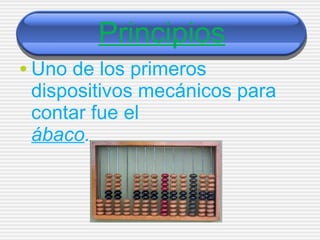 Los primeros dispositivos mecánicos para contar incluyeron el ábaco. Más adelante, inventos como la Pascalina y la máquina de Leibniz representaban datos mediante posiciones de engranajes. La primera computadora fue la máquina analítica de Charles Babbage, un dispositivo mecánico para sumas repetidas. Posteriormente surgieron máquinas como la de Hollerith y la Mark I, las cuales usaban tarjetas perforadas para almacenar datos e instrucciones.