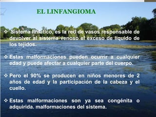 Este documento describe el linfangioma, una malformación del sistema linfático que generalmente ocurre en niños menores de 2 años y afecta la cabeza y el cuello. El linfangioma se clasifica en tres subtipos dependiendo del tamaño de los vasos linfáticos afectados. Puede causar macroglosia u otras masas y su diagnóstico diferencial incluye hemangioma y mucocele. El tratamiento más efectivo ahora es mediante agentes esclerosantes administrados por radiólogos intervencionistas.