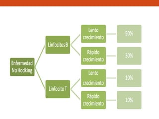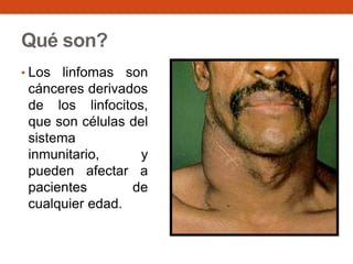 Este documento proporciona información sobre los linfomas de Hodgkin y no Hodgkin. Explica que los linfomas son cánceres que afectan a los linfocitos. Describe los síntomas, pruebas de diagnóstico e incluye detalles sobre los diferentes tipos y estadios de linfoma, así como opciones de tratamiento como quimioterapia y radioterapia.