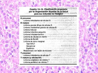 Este documento describe diferentes tipos de linfomas, incluyendo la enfermedad de Hodgkin, el linfoma no Hodgkin, el linfoma de Burkitt y varios subtipos de linfomas. Explica sus características epidemiológicas, anatomopatológicas, síntomas, diagnóstico, tratamiento y pronóstico.