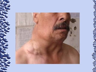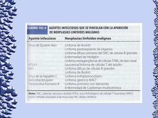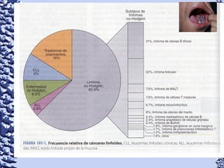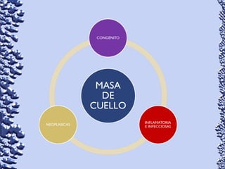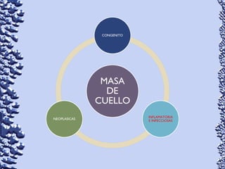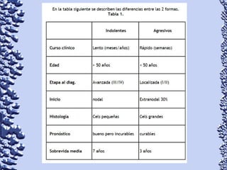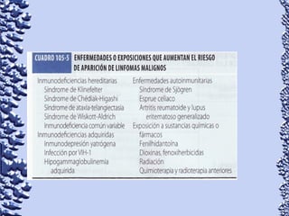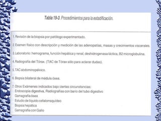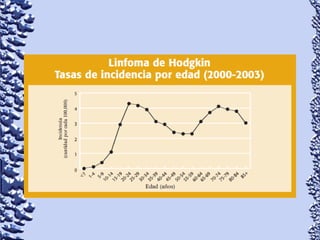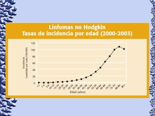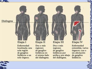 Este documento proporciona información sobre linfoma de Hodgkin y linfoma no Hodgkin. Define el linfoma como un tipo de cáncer que comienza en el sistema linfático. Describe las características clínicas, epidemiología, patología, clasificación, manifestaciones, tratamiento y pronóstico de ambos tipos de linfoma. También menciona otros tipos de masas en el cuello como causas diferenciales de linfoma.