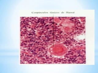 Los capilares linfáticos tienen un diámetro mayor que los capilares sanguíneos y carecen de poros o fenestras. Presentan un trayecto tortuoso con calibres irregulares que contienen válvulas para impedir el reflujo de la linfa. El bazo contiene zona cortical y medular, con nódulos linfoideos rodeados de tejido conectivo que producen linfocitos. El timo contiene zona cortical rica en linfocitos y macrófagos, separada de la medular por células