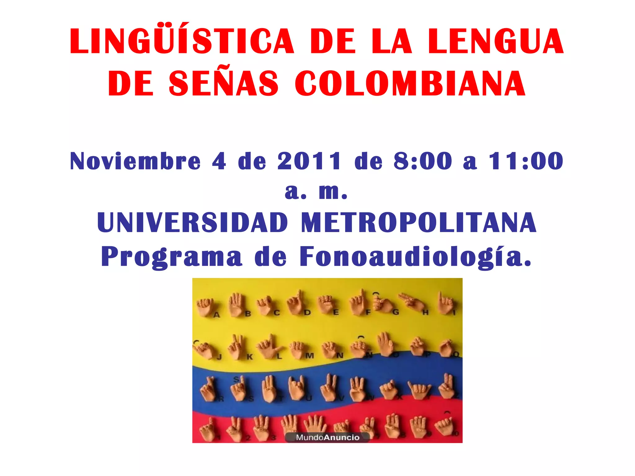 La lingüística de la lengua de señas colombiana es el tema de una conferencia de 3 horas que se llevará a cabo el 4 de noviembre de 2011 de 8:00 a 11:00 a.m. en la Universidad Metropolitana como parte del programa de Fonoaudiología.