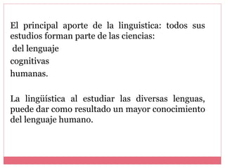 La lingüística es la ciencia que estudia el lenguaje humano y sus fenómenos como las lenguas, su origen, evolución y ubicación geográfica. Sus estudios forman parte de las ciencias del lenguaje, cognitivas y humanas. Al estudiar diversas lenguas, puede dar como resultado un mayor conocimiento del lenguaje humano. Se divide en campos como fonética, fonología, morfología, sintaxis, semántica, lexicografía y otros que estudian diferentes aspectos del lenguaje.