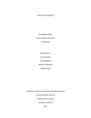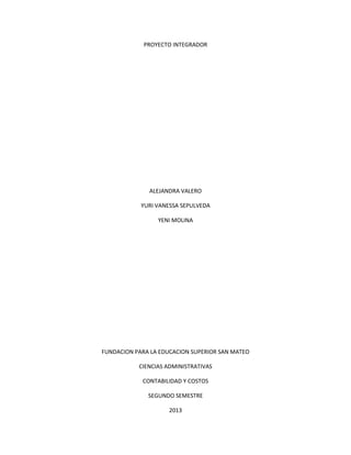 Este documento presenta un proyecto integrativo realizado por Alejandra Valero, Yuri Vanessa Sepúlveda y Yeni Molina para la Fundación para la Educación Superior San Mateo sobre contabilidad y costos durante el segundo semestre de 2013, el cual fue presentado a varios profesores para su revisión y contenía ejercicios de contabilidad.