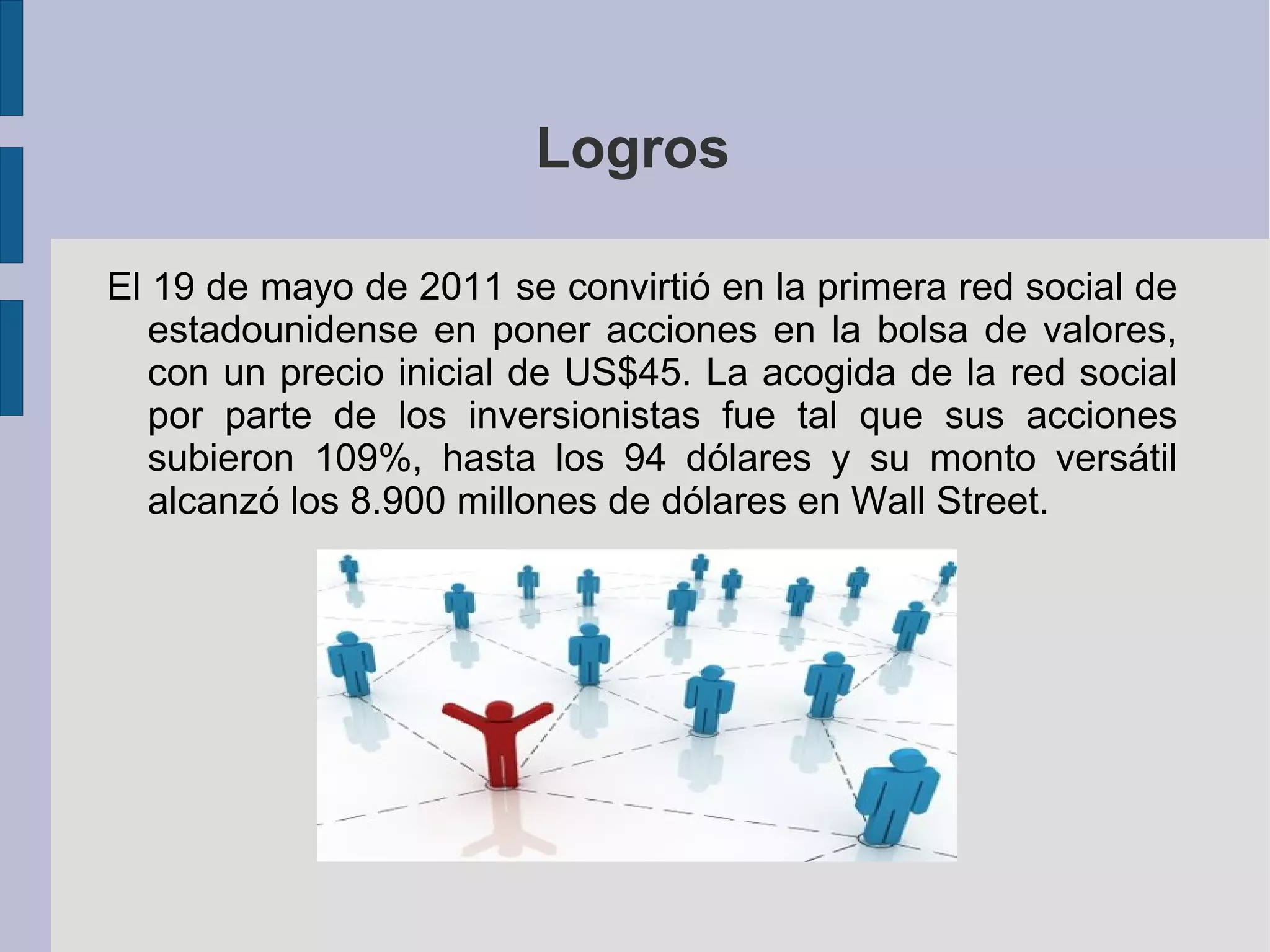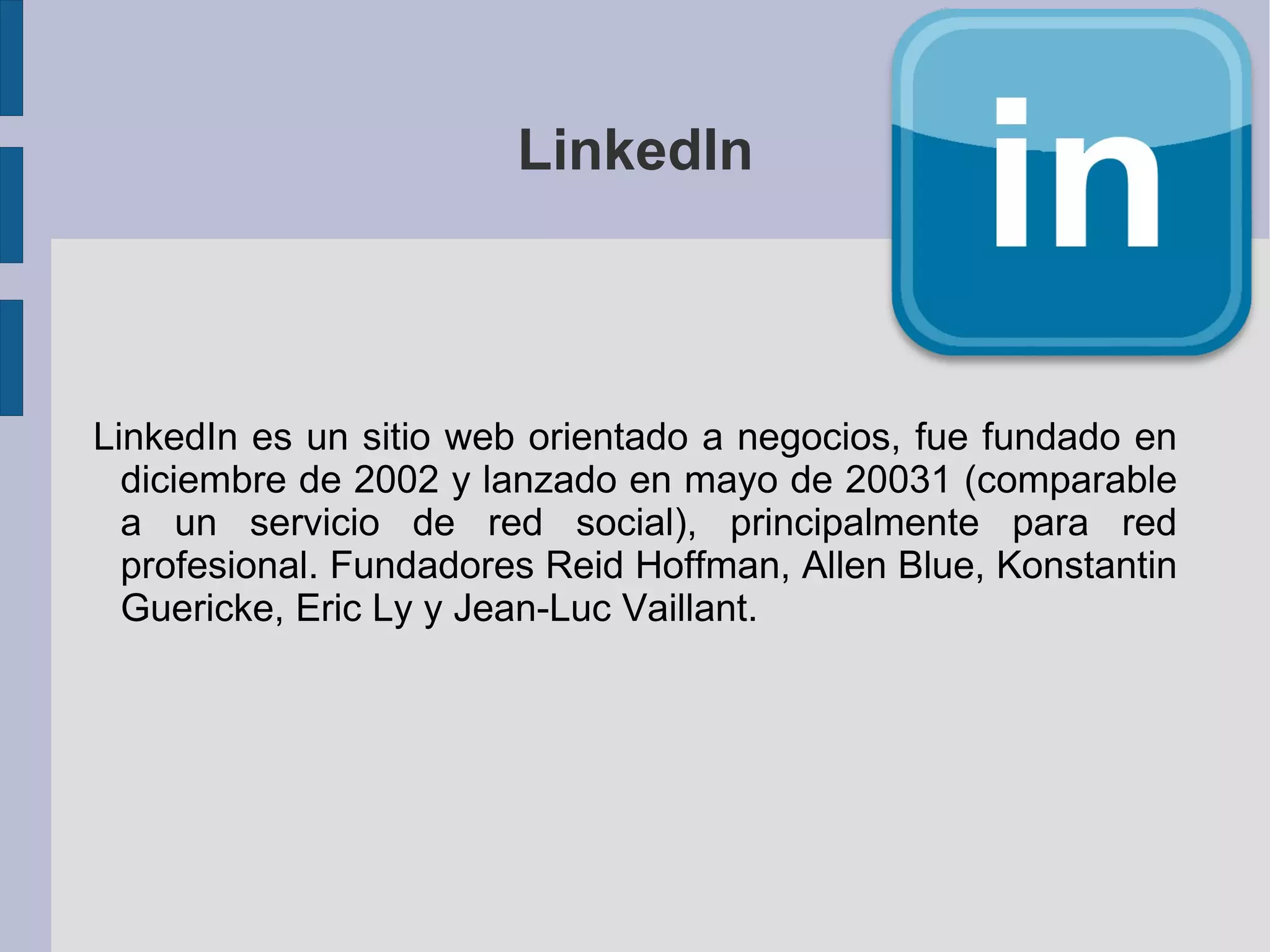 LinkedIn es una red social profesional fundada en 2002, lanzada al público en 2003 por Reid Hoffman y otros. Se destacó al convertirse en la primera red social estadounidense que cotiza en bolsa en 2011, con un aumento significativo en el valor de sus acciones. A partir de 2011, cuenta con más de 100 millones de usuarios en 200 países, facilitando la conexión profesional.
