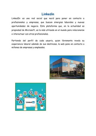 LinkedIn es una red social para profesionales que permite poner en contacto a usuarios y empresas para encontrar oportunidades laborales y de negocio. Los usuarios crean perfiles profesionales donde comparten su experiencia y habilidades para que otras personas u organizaciones los contacten. Actualmente es propiedad de Microsoft y es la plataforma más utilizada a nivel mundial para establecer conexiones profesionales.