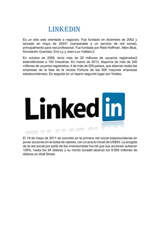 Este documento proporciona información sobre LinkedIn, una red social profesional fundada en 2002. Explica cómo crear una cuenta en LinkedIn y acceder a ella. También brinda detalles sobre el crecimiento de LinkedIn, con más de 200 millones de usuarios registrados en 2013. Finalmente, enumera algunas posibilidades laborales en las que LinkedIn puede ser útil para buscar empleo.