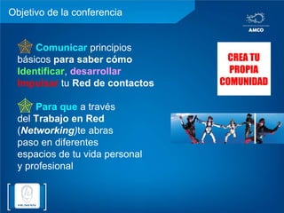 Este documento presenta una conferencia sobre el arte de crear redes de contactos más allá de un solo contacto. Explica que el trabajo en red (networking) es cultivar relaciones de beneficio mutuo para dar y recibir. Se analizan conceptos como las redes sociales, el individuo, la comunidad y las redes. También cubre temas como identificar, desarrollar e impulsar la propia red de contactos con el objetivo de abrir oportunidades personales y profesionales a través del trabajo en red.