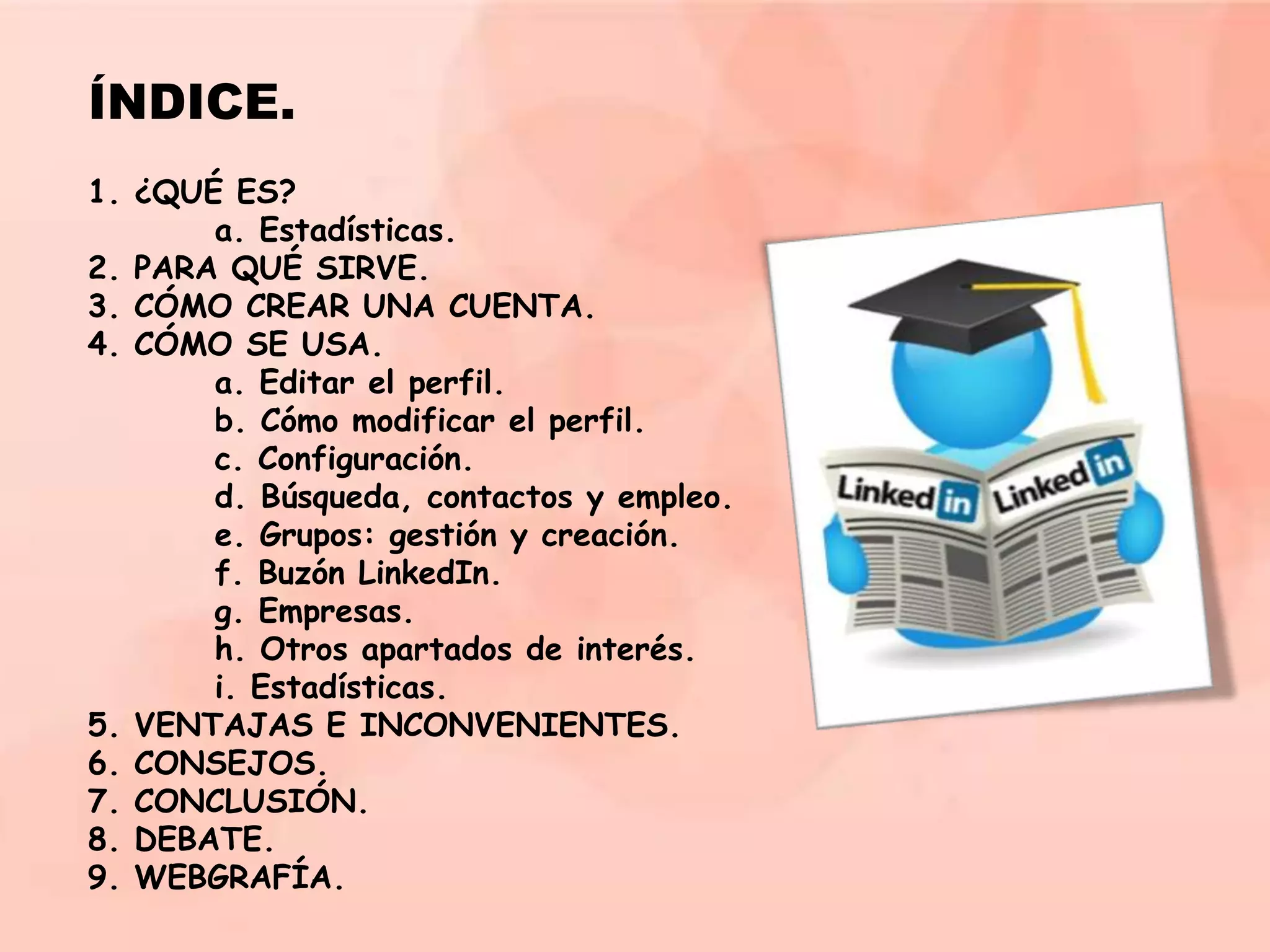 Este documento proporciona una introducción a LinkedIn, la mayor red profesional del mundo. Explica qué es LinkedIn, cómo crear un perfil, cómo usar las diferentes funciones como editar el perfil, buscar contactos, unirse a grupos, y analiza las ventajas e inconvenientes de usar esta red. También incluye consejos para sacar el máximo provecho de LinkedIn y mejorar el perfil profesional.