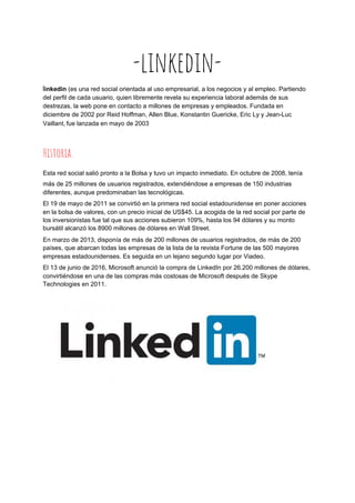 LinkedIn es una red social orientada a los negocios y el empleo donde los usuarios pueden crear perfiles profesionales y conectarse con otras personas. Fue fundada en 2002 por Reid Hoffman y otros y se ha convertido en la principal red para profesionales con más de 200 millones de usuarios. En 2016, Microsoft compró LinkedIn por 26.200 millones de dólares.