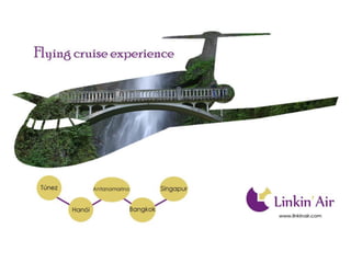 Este documento presenta una propuesta para una nueva aerolínea llamada Linkin' Air. Ofrecería paquetes de viaje personalizables que conectan varias ciudades populares a través de tres rutas principales (Exotic Link, Capitals Link, Beach & Party Link) y rutas adicionales en otras regiones. Linkin' Air proporcionaría transporte privado desde los aeropuertos hasta los hoteles asociados, permitiendo a los clientes organizar viajes a múltiples destinos en poco tiempo de una manera cómoda y sin prisas.