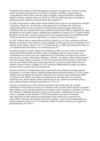 Linkin Park es una banda estadounidense de rock formada en 1996 en Los Ángeles. Su álbum debut Hybrid Theory de 2000 tuvo un gran éxito comercial vendiendo más de 24 millones de copias. Su siguiente álbum Meteora de 2003 también alcanzó el número 1 en las listas de popularidad. Linkin Park es conocida por mezclar estilos como rock, rap y electrónica. Han vendido más de 50 millones de discos y han ganado dos premios Grammy.