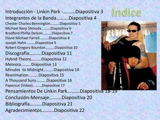 Linkin Park es una influyente banda estadounidense de nu metal formada en Agoura Hills, California, conocida por su álbum debut 'Hybrid Theory', lanzado en 2000, que se convirtió en el álbum más vendido de ese año en EE. UU. La banda, integrada por Chester Bennington, Mike Shinoda, Brad Delson, David Farrell, Joseph Hahn y Rob Bourdon, ha lanzado varios álbumes exitosos como 'Meteora' y 'Minutes to Midnight'. A lo largo de su carrera, han inspirado a muchos a través de su música y el trabajo en conjunto con un enfoque en la creatividad y el apoyo mutuo.
