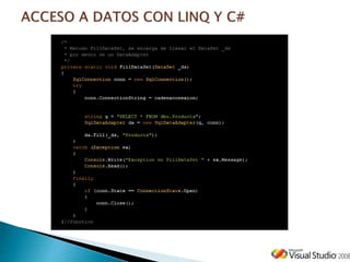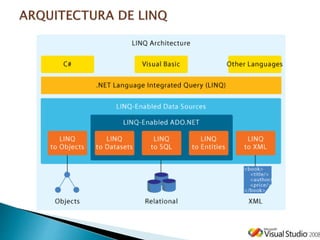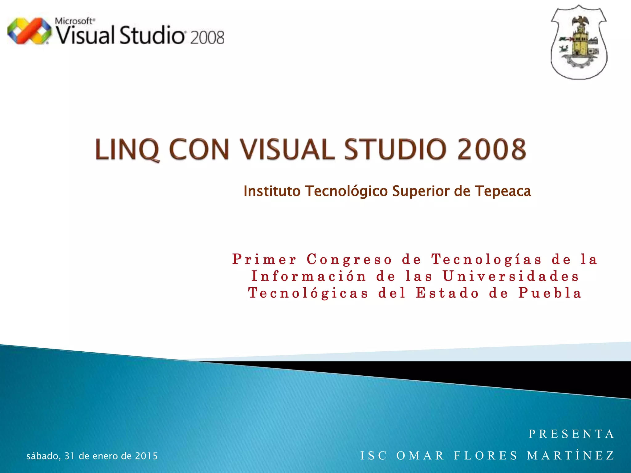 El primer congreso de tecnologías de la información en Tepeaca presenta una introducción al lenguaje de consultas integradas (LINQ) de Microsoft, el cual permite realizar consultas de datos de manera eficiente en diversos orígenes de datos utilizando sintaxis similar a SQL. Se discuten las arquitecturas de LINQ, su uso con colecciones, documentos XML y bases de datos, así como la implementación de consultas con ejecución diferida e inmediata. Además, se destacan las capacidades de LINQ para interactuar con ADO.NET y SQL Server, facilitando la programación y el acceso a datos mediante un modelo orientado a objetos.