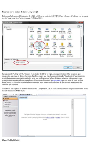 Este documento describe cómo crear un modelo de datos en LINQ to SQL mediante el diseñador de LINQ to SQL en Visual Studio. Explica cómo mapear tablas y vistas de una base de datos a clases de entidad, definir relaciones entre clases, retrasar la carga de propiedades, y mapear procedimientos almacenados como métodos en la clase DataContext.