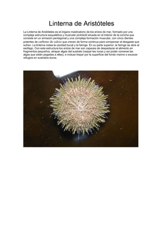 La Linterna de Aristóteles es el órgano masticatorio de los erizos de mar, formado por una estructura esquelética y muscular pentagonal protráctil con cinco dientes potentes de carbonato de calcio que crecen continuamente para compensar el desgaste, permitiendo a los erizos despedazar el alimento, raspar algas de las rocas y trepar o excavar.