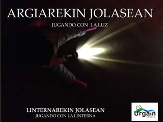 El documento describe diferentes formas de jugar con una linterna en una habitación oscura, incluyendo usar CDs y agua para crear proyecciones, o usar papeles oscuros para proyectar formas e imágenes.