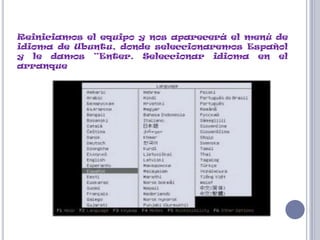 El documento describe los pasos para instalar Ubuntu, incluyendo seleccionar el idioma español, particionar el disco duro, crear un usuario y contraseña, y reiniciar para completar la instalación de Ubuntu.