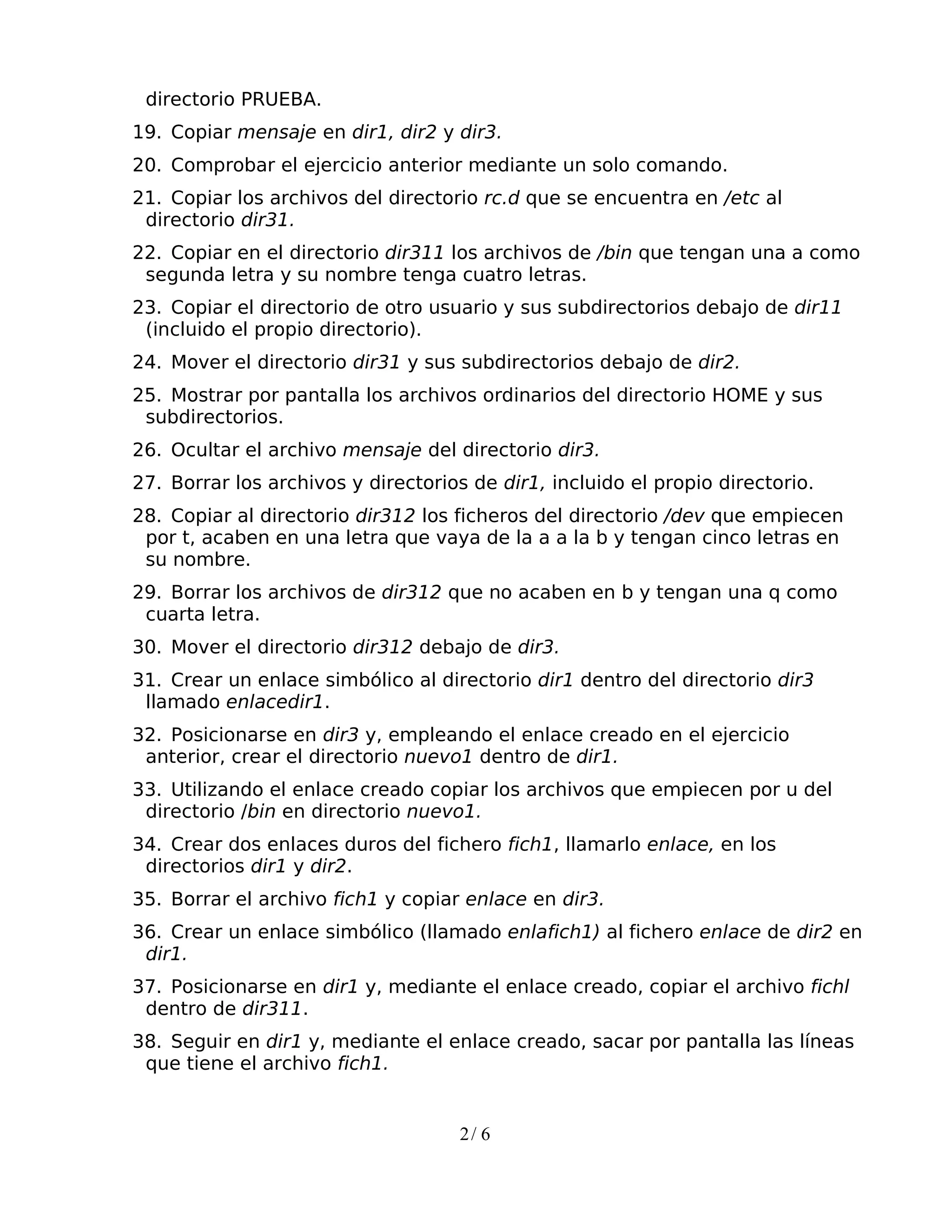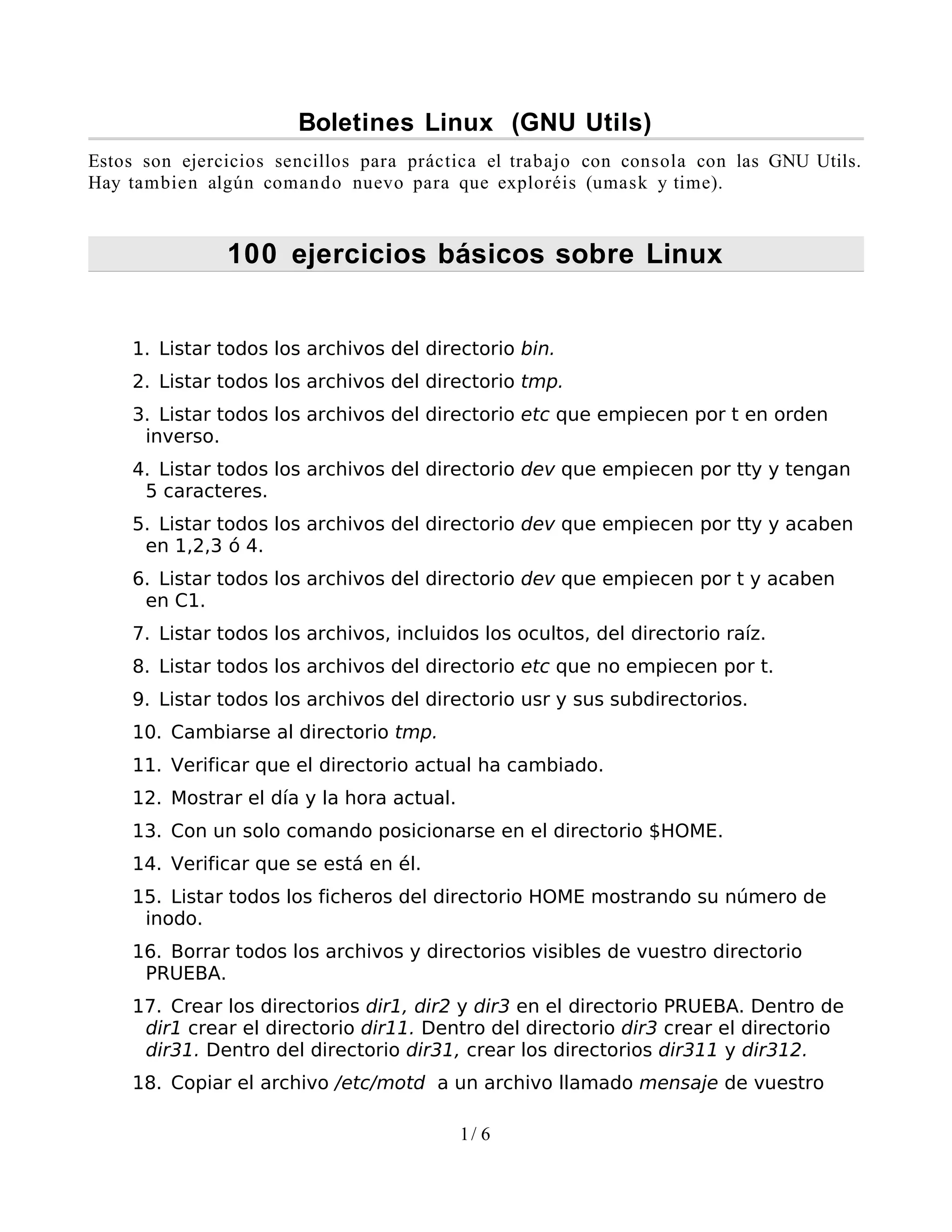 Este documento contiene 93 ejercicios básicos sobre el uso de comandos de Linux en la consola. Los ejercicios cubren tareas como listar archivos y directorios, mover y copiar archivos entre directorios, crear enlaces simbólicos y duros, y administrar permisos de acceso a archivos y directorios. También incluye ejercicios para trabajar con procesos del sistema como who, ps y top.