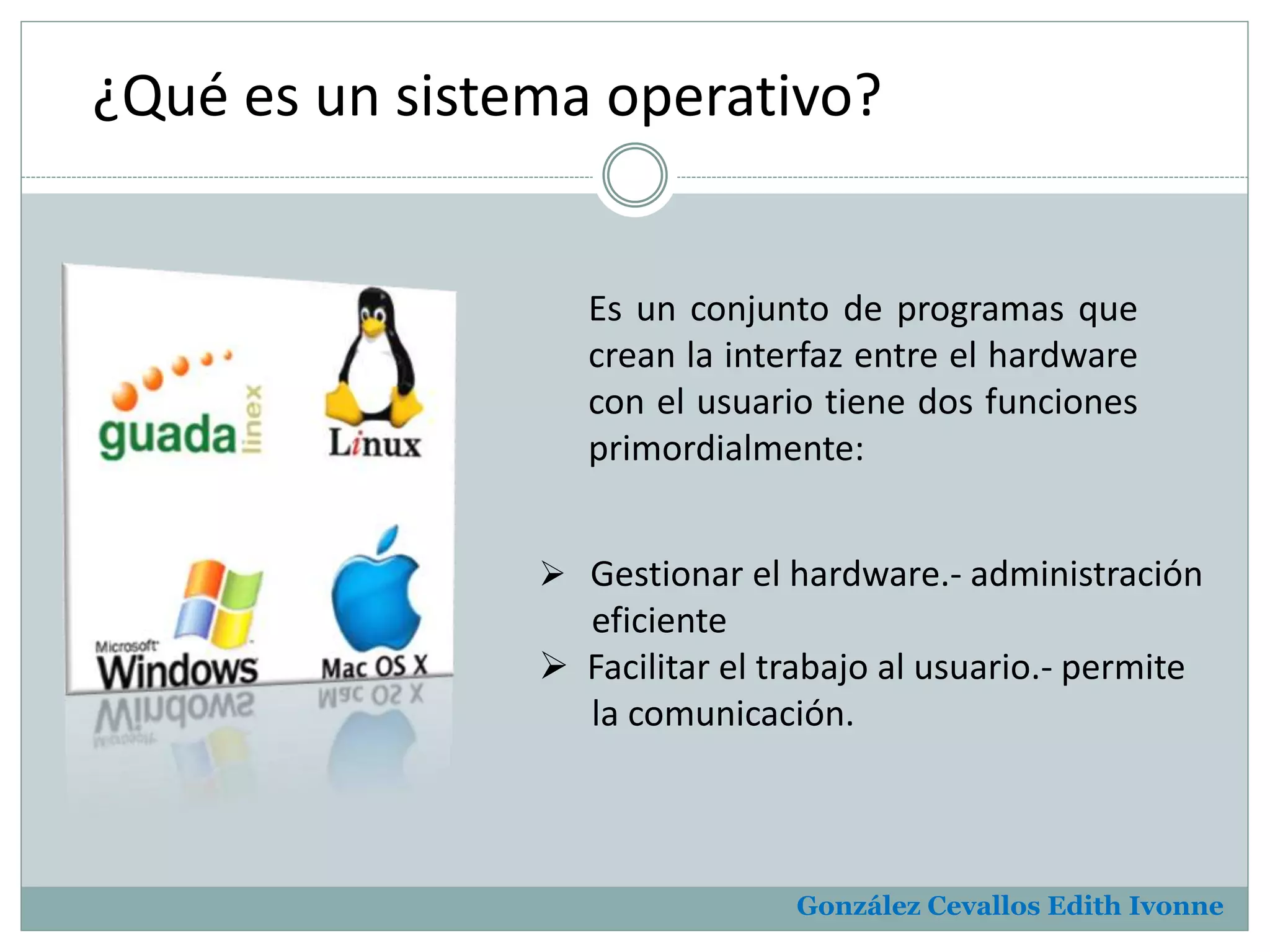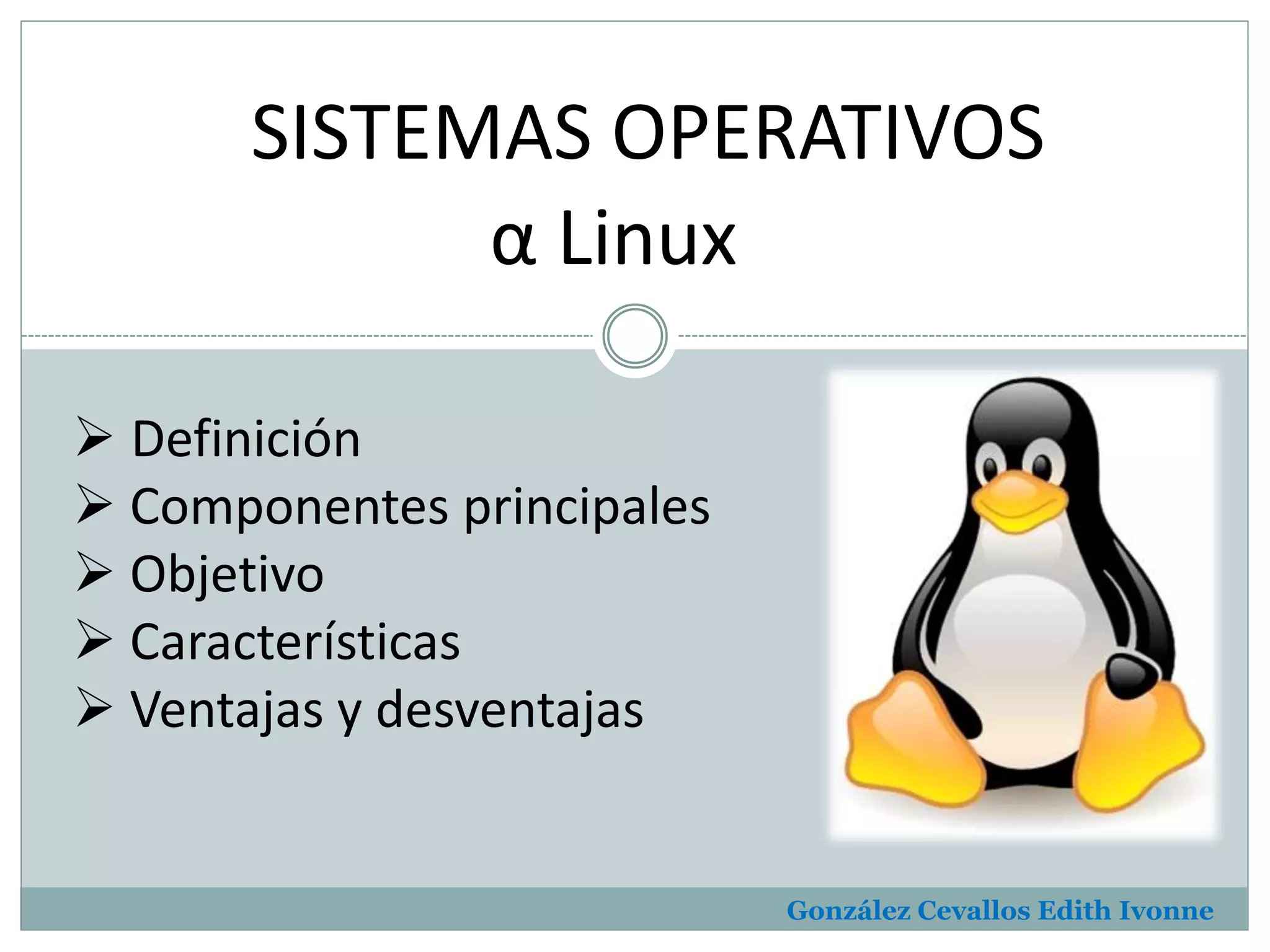 Este documento describe los sistemas operativos, específicamente Linux. Explica que un sistema operativo es un conjunto de programas que crean una interfaz entre el hardware y el usuario, gestionando el hardware de manera eficiente y facilitando el trabajo del usuario. Luego describe los componentes principales de Linux, sus objetivos y características, ventajas y desventajas en comparación con otros sistemas operativos como Windows y Unix.