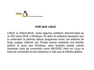 Linux es un sistema operativo libre y gratuito que puede usarse como alternativa a Windows o DOS. Ofrece una interfaz gráfica similar a Windows pero también permite usar línea de comandos. Entre sus características principales están su robustez, estabilidad, soporte multiusuario y multiplataforma. Debido a su potencia, gratuidad y otras ventajas, Linux se está posicionando como un sistema operativo líder.