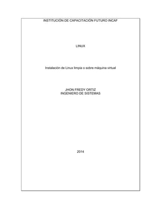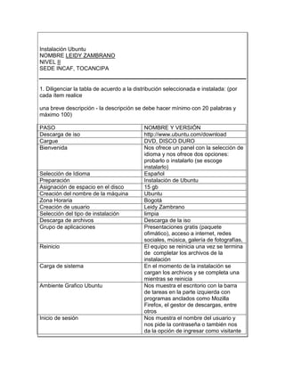 Este documento describe los pasos para instalar Ubuntu 11.10 en una máquina virtual usando VirtualBox. Explica cómo descargar la ISO de Ubuntu, seleccionar el idioma español durante la instalación, asignar 15GB de espacio en el disco, crear el usuario Leidy Zambrano, e instalar Ubuntu limpiamente. Tras completar la instalación, muestra el escritorio de Ubuntu con la barra de tareas en la izquierda y el gestor de actualizaciones en la parte superior izquierda.