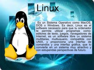 Linux es un sistema operativo de código abierto similar a Windows o MacOS que permite ejecutar programas como editores de texto, navegadores web y juegos. Existen diferentes distribuciones de Linux como Ubuntu, Debian y Fedora. Ubuntu es la distribución más popular, usada por aproximadamente el 30% de los usuarios de Linux.