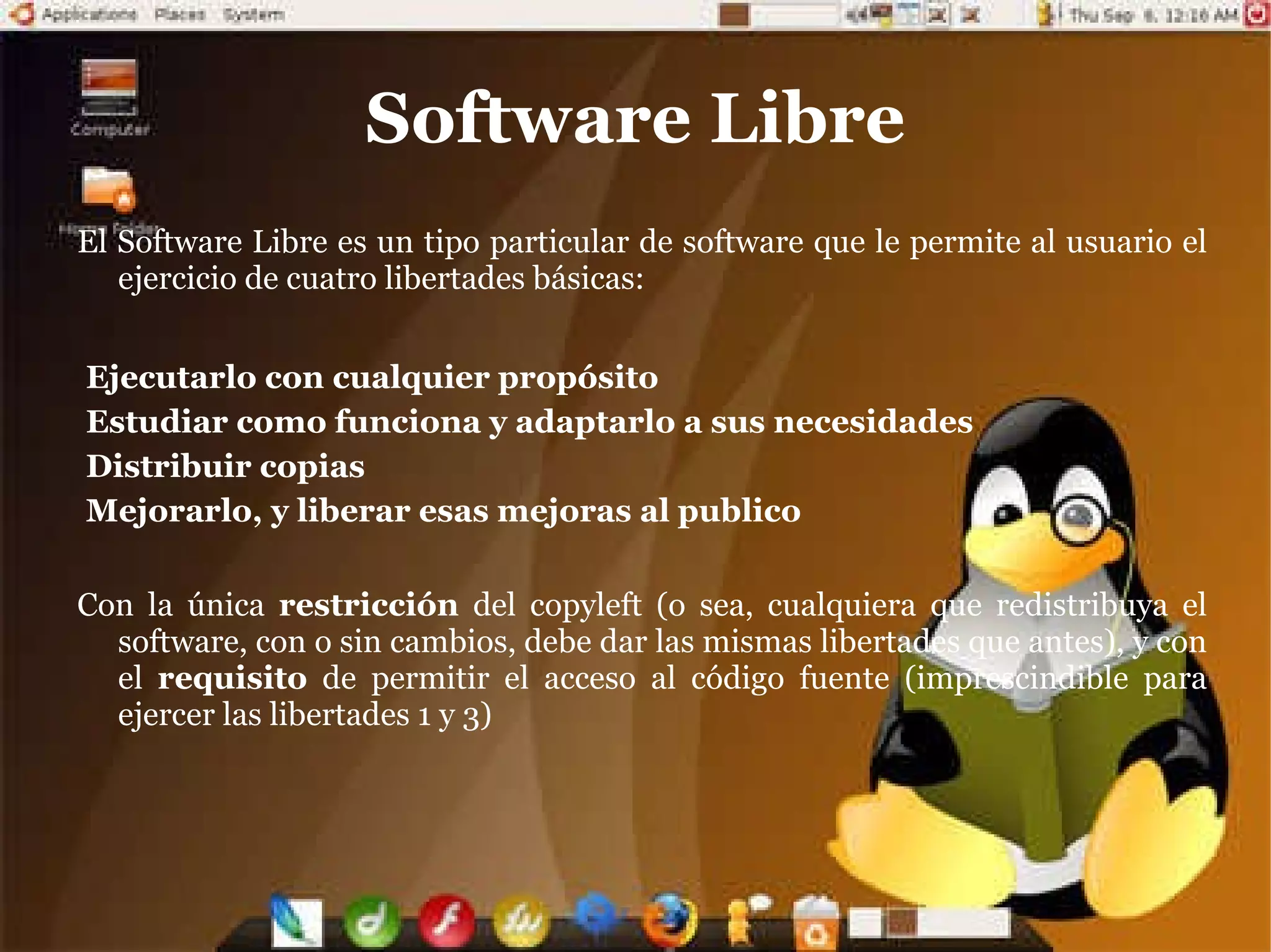El documento define el software libre como un tipo de software que permite cuatro libertades básicas: ejecutarlo con cualquier propósito, estudiar y adaptar su código, distribuir copias, y mejorarlo y liberar esas mejoras. Explica que el software libre siempre es de código abierto y está protegido con licencias de copyleft. También destaca algunas ventajas como el escrutinio público y la independencia del proveedor.
