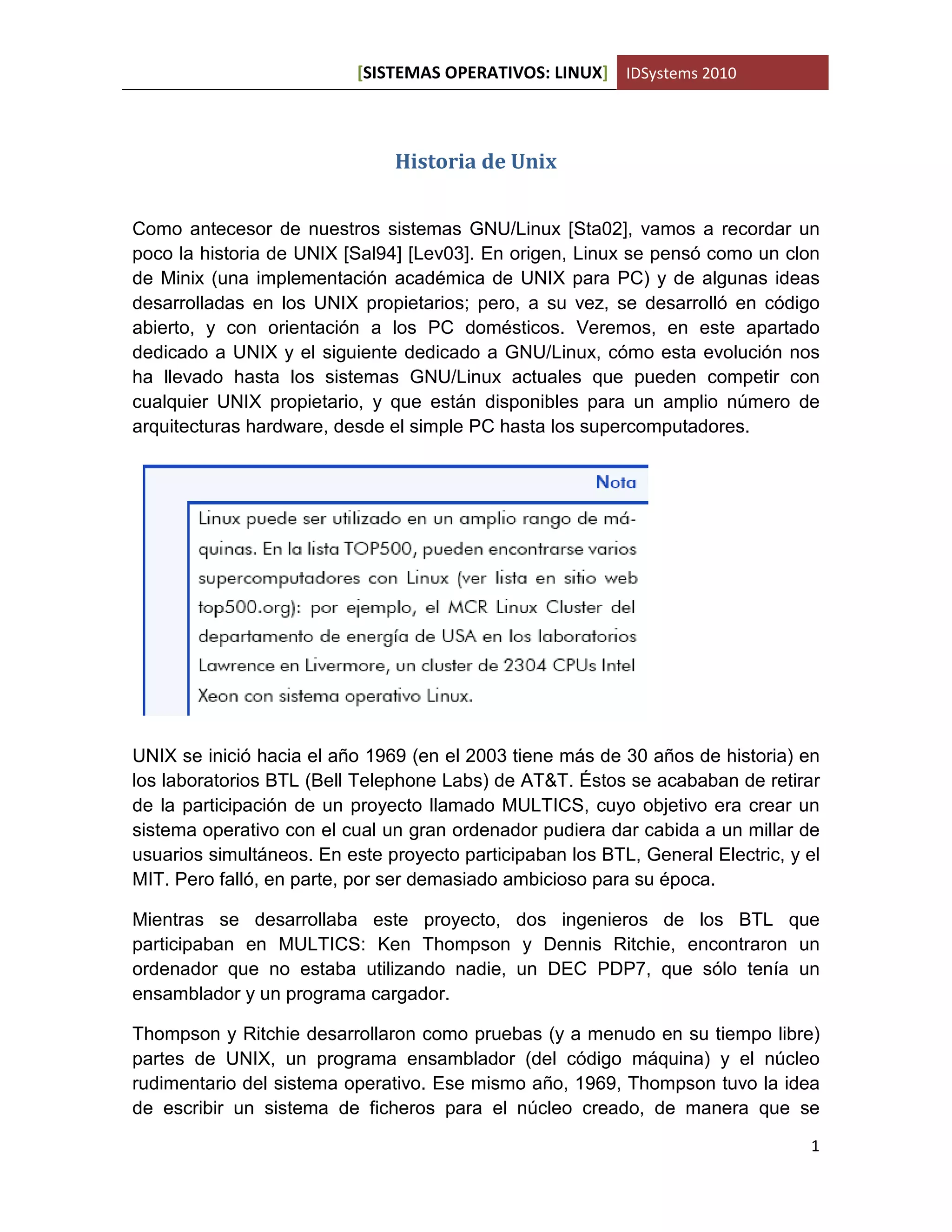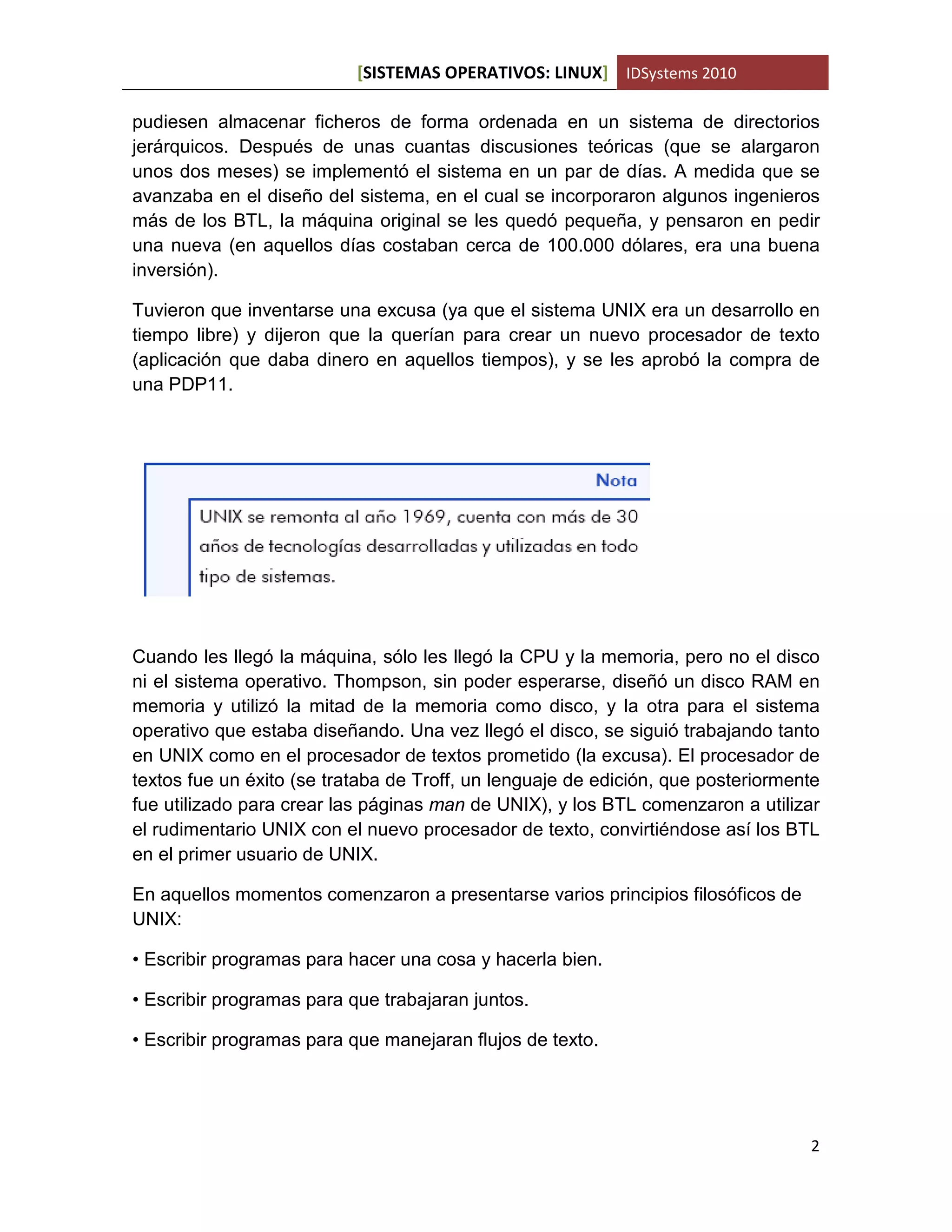 Unix se originó en 1969 en los laboratorios Bell como un proyecto de dos ingenieros para crear un pequeño sistema operativo. Más adelante se desarrolló en la Universidad de California en Berkeley, donde se añadieron nuevas características y aplicaciones como el editor de texto vi. En la década de 1980, las restricciones de AT&T llevaron a Andrew Tanenbaum a crear el sistema operativo Minix, que luego inspiró a Linus Torvalds a desarrollar Linux, el núcleo del sistema operativo GNU/Linux.