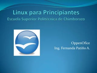 OpenOffice es un paquete de software libre que incluye aplicaciones para procesamiento de texto (Writer), hojas de cálculo (Calc), presentaciones (Impress), dibujo (Draw), bases de datos (Base) y formularios (Form). Writer permite crear, abrir, guardar y exportar documentos de texto. Su interfaz incluye menús para archivo, edición, vista, inserción, formato, tabla y herramientas.