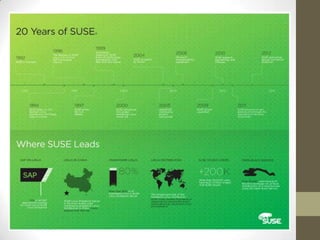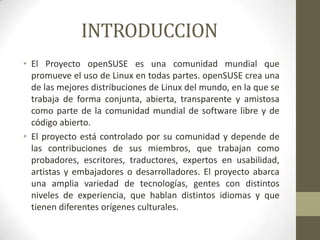 El documento habla sobre openSUSE, una de las mejores distribuciones de Linux. openSUSE es controlado por su comunidad global y depende de contribuciones de miembros que trabajan como probadores, escritores, traductores y más. SUSE fue fundada en 1992 en Alemania y ha publicado más de 13 versiones principales de su distribución Linux desde 1994.